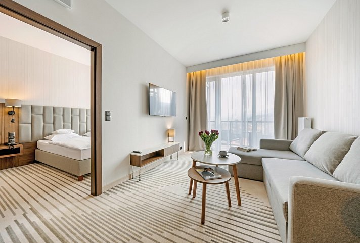 ca. 39 qm, Doppel, Hauptgebäude, separates Schlafzimmer, separater Wohnraum, 1 Sofabett, 1 Bad, Dusche, WC, Bademantel, Badeslipper, Klimaanlage, Heizung, Minibar kostenpflichtig, Safe, TV (Sat-TV), WLAN, Wasserkocher, Kaffee/Tee, Kühlschrank, Balkon