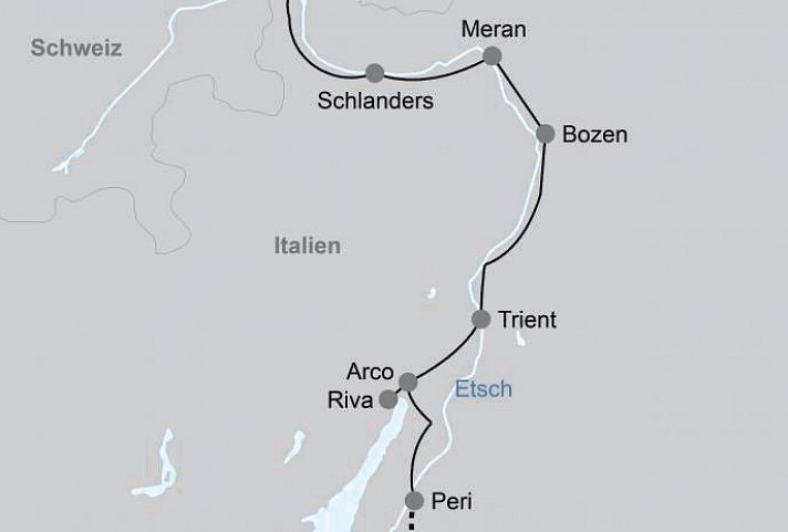 Die Adige, wie die Etsch in Italien genannt wird, zählt mit einer Länge von über 400 km zu den längsten Flüssen Italiens. Kulturell bedeutsame Städte wie Trient, Bozen und Verona gestalten einen Radurlaub entlang der Etsch zu einem äußerst interessanten Erlebnis. Vom gebirgigen Reschensee radelt man meist bergab entlang der Etsch Richtung Süden und lässt sich den mediterranen Wind um die Nase wehen. Aufgrund der meist ebenen Wegführung ist der Etsch-Radweg auch für Familien mit Kindern geeignet. Radeln Sie von Südtirol immer weiter nach Italien hinein – mit jedem Pedaltritt wird es ein bisschen italienischer. Wir wünschen Buon viaggio!