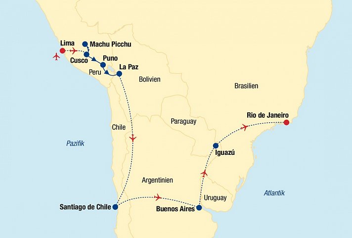 - 5 Inlandsflüge (Lima - Cusco, La Paz - Santiago de Chile, Santiago de Chile - Buenos Aires, Buenos Aires - Iguazú, Iguazú - Rio de Janeiro; Umsteigeverbindungen möglich)