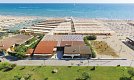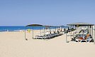 Sandstrand: flach abfallend, von der Anlage getrennt durch Promenade, Sonnenschirme, Liegen, Strandtuch/Badetuch