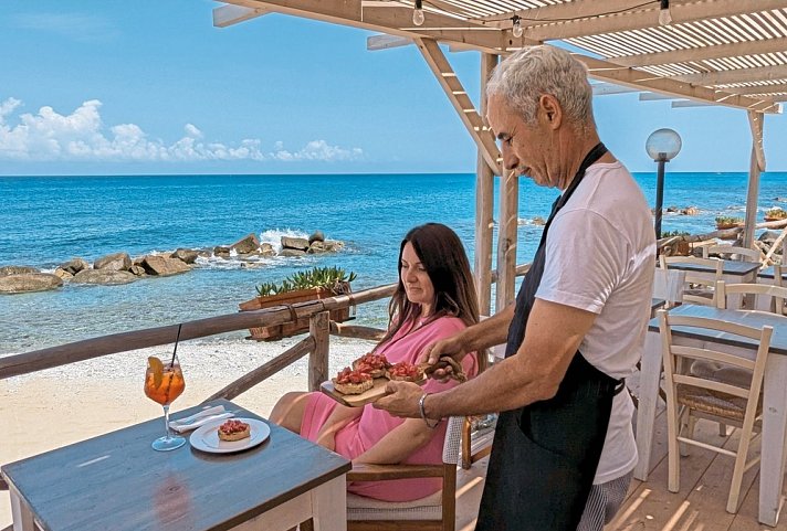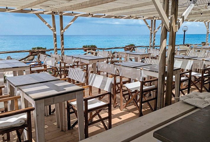 Sehr beliebt bei Gästen ist der kleine Club direkt am Strand. Weiß und blau sind der Sand und das Meer, weiß und blau sind auch die Sonnenschirme, unter denen Sie Platz nehmen und „La Dolce vita“ genießen.
