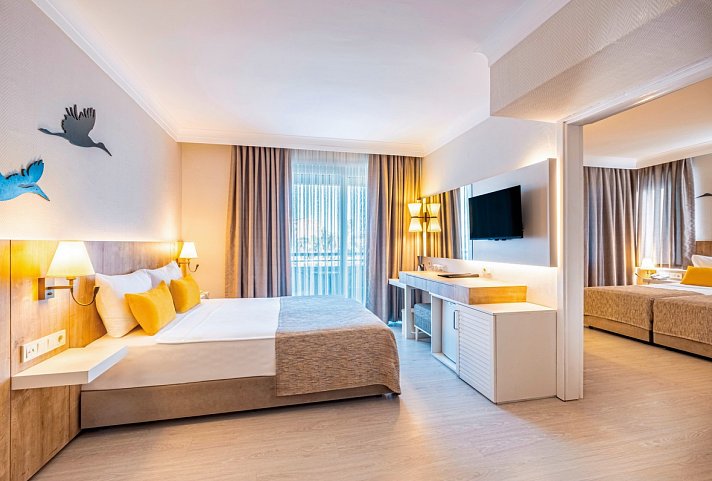31-35 qm, Familien, Hauptgebäude, Meerblick, 2 separate Schlafzimmer, 1 Bad, Dusche, WC, Klimaanlage, zentral gesteuert, Minibar, Auffüllung täglich, Softdrinks, Mineralwasser, Wasser, Safe, 1 TV (Sat-TV, Smart-TV), Wasserkocher, Kaffee/Tee, Balkon