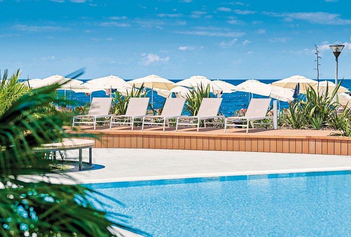 Moderne Eleganz prägt die Ausstattung des stilvollen Strandhotels. Während das Restaurant die Gaumen verwöhnt, locken Pool und Meer mit glasklarem Wasser und herrlichen Ruheplätzen.