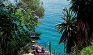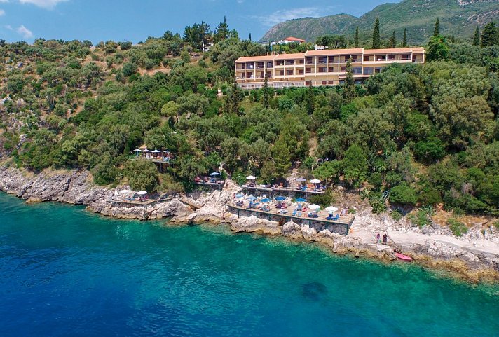 An der felsigen Küste oberhalb des tiefblauen Meers thront das Hotel mit herrlichem Panoramablick. Verschiedene Sonnendecks und Terrassen finden Sie unten am Meer – mit sonnigen und schattigen Plätzen.