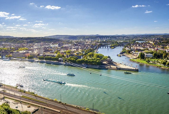 Heute lockt ein Abstecher (ca. 4 km) zur mittelalterlichen Burg Eltz, eine der schönsten und besterhaltenen Burgen Deutschlands. Wundervoll romantisch gelegen und eingebettet in eine ursprüngliche Natur, wirkt sie wie ein wahr gewordenes Märchenschloss, einladend und majestätisch zugleich. Nehmen Sie an einer informativen Burgführung (fakultativ) teil. Anschließend radeln Sie zurück zum Mosel-Radweg und radeln bis in den Weinort Kobern-Gondorf. Besuchen Sie hier ein Terrassen-Weingut mit seinen felsigen Steillagen, die zum größten Teil nur in Handarbeit bebaubar sind. In diesen Steilhängen wachsen hauptsächlich Riesling und Spätburgundertrauben heran. Informieren Sie sich direkt beim Winzer über seine Arbeit und seine Produkte. Genießen Sie die letzten Kilometer entlang der Mosel, unternehmen Sie noch einen Abstecher durch den Weinort Winningen, der zu den schönsten Dörfern in Deutschland zählt und freuen Sie sich auf den Tagesausklang in Koblenz – der Stadt am Deutschen Eck. Eine Nacht in Koblenz. Ca. 43-48 km (Frühstück)
