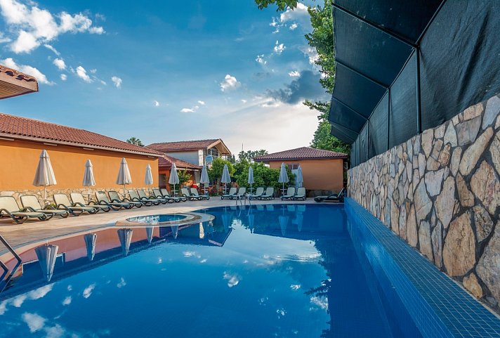 Das kleine Boutiquehotel am Meer heißt seit 35 Jahren Gäste nahe Side willkommen. Mediterrane Pflanzen wie Orangen, Zitronen, Feigen, Mandeln, Lavendel und Co. verströmen ihren betörenden Duft im Hotelgarten.