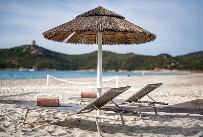 Sandstrand: Sonnenschirme, Liegen, 1 Sonnenschirm und 2 Liegen pro Zimmer ab der 3. Strandreihe, Zug zum Strand kostenfrei
