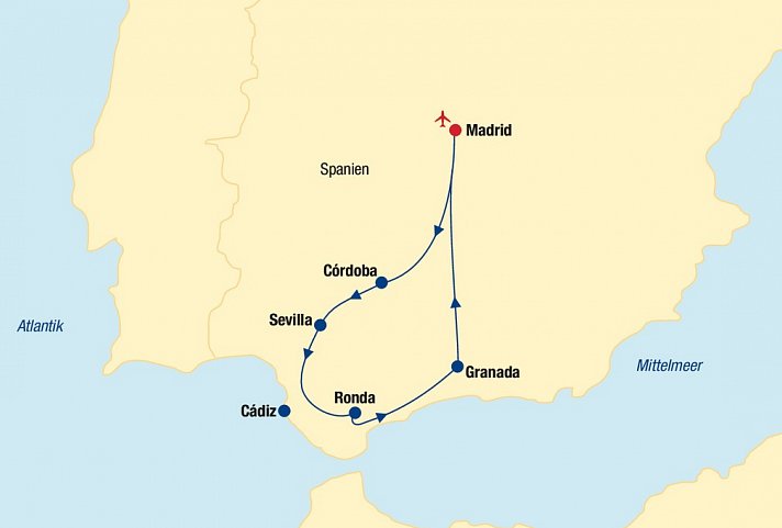 ¡Hola y bienvenido! im Herzen Spaniens! Der feurige Süden Spaniens erwartet Sie mit beeindruckenden Städten, historischen Bauwerken, facettenreichen Landschaften, gastfreundlichen Menschen und kulinarischen Genüssen. Sie starten in der spanischen Metropole Madrid. Durch das zauberhafte Hinterland reisen Sie weiter in den Süden nach Andalusien und besuchen zunächst die reizvolle Stadt Córdoba mit ihrer maurischen Altstadt und der weltberühmten Kathedrale Mezquita. In der pulsierenden Metropole Sevilla erwartet Sie u.a. die größte gotische Kathedrale der Welt. Ein weiterer Höhepunkt Ihrer Reise ist zweifelsohne die Führung durch die weltberühmte Festungs- und Palastanlage Alhambra in Granada. Zum krönenden Abschluss erkunden Sie die königliche Hauptstadt Madrid bei einer Stadtrundfahrt.