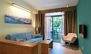 51-60 qm, Appartement, Superior, renoviert (2019), separates Schlafzimmer, Twinbett, Sofabett, Dusche, WC, Haartrockner, Kosmetikspiegel, Fliesen, Klimaanlage, Ventilator, Mini-Kühlschrank, Safe, 2 TVs (Sat-TV), Kochnische, Essecke, Gas-/E-Herd, Gefrierfach, Wasserkocher, Mikrowelle, Kaffeemaschine, Toaster, Balkon oder Terrasse (möbliert), Bettwäschewechsel (2 x wöchentlich), Handtuchwechsel (3 x wöchentlich), Zwischenreinigung (kostenfrei, 5 x wöchentlich)