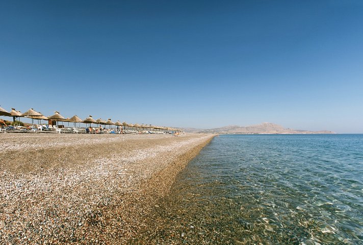 Kiesstrand: flach abfallend, Sonnenschirme, Liegen, Strandtuch/Badetuch