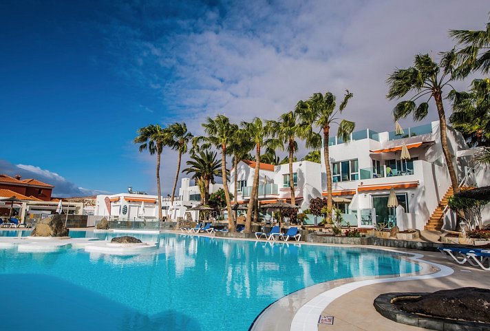 Die hellen, komfortabel eingerichteten Studios und Appartements mit eigener Küche laden zum Wohlfühlen ein. Ein Highlight der Anlage ist die palmengesäumte Poollandschaft – wunderschön!