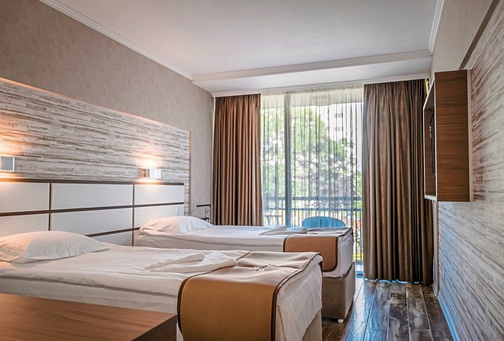 16-20 qm, Doppel, Parkblick, Poolblick, Bettwäsche, Handtücher und Matratzen aus 100% Bio-Baumwolle, 1 Bad, Dusche, WC, Haartrockner, Fliesen, Klimaanlage, 1 TV (Kabel-TV), WLAN, Kühlschrank, Balkon, Bettwäschewechsel (2 x wöchentlich), Handtuchwechsel (3 x wöchentlich)