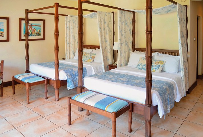 Eingebettet in einen riesigen Garten neigt sich die Anlage einem wunderschönen Strand entgegen. Ein weiteres Highlight ist die Poollandschaft, deren drei Becken durch Wasserfälle verbunden sind. Mächtige Baobab-Bäume spenden auch in der Mittagssonne Schatten.