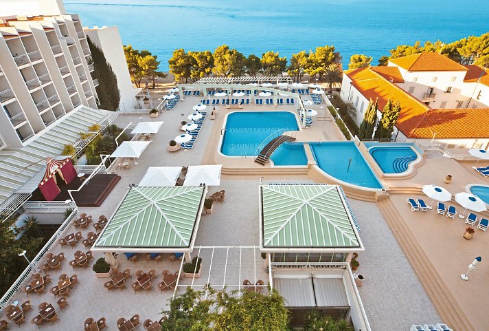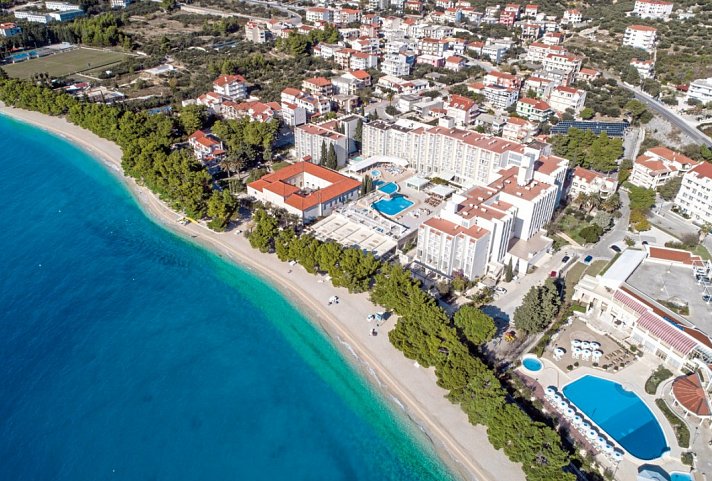 Hier verbringen Sie Komforturlaub am herrlich weißen Kiesstrand von Tucepi! Eine verkehrsfreie Promenade trennt die Anlage vom Badeglück im Meer. Genießen Sie die Sonnenuntergänge – traumhaft!