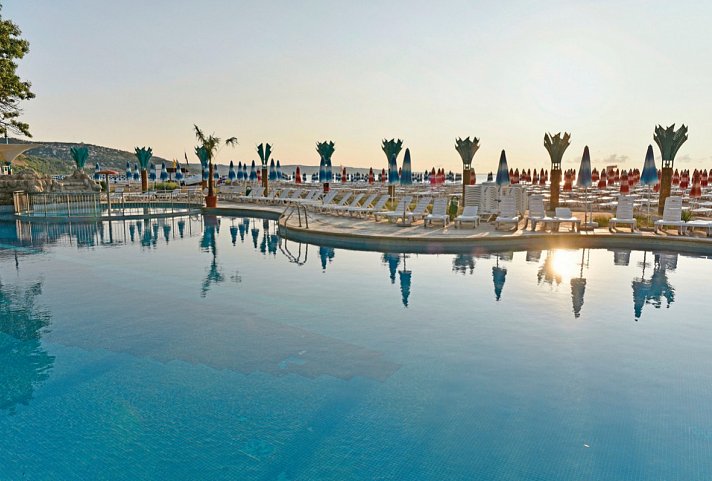 All Inclusive: Frühstück (Buffet), Mittagessen (Buffet), Abendessen (Buffet), Getränke kostenfrei (Softdrinks, Mineralwasser, Kaffee/Tee, Bier, lokale Spirituosen, 10-23 Uhr), Snacks (15-17 Uhr), Kaffee/Tee und Gebäck (15-17 Uhr), Eis (12-14:30 Uhr und 15-17 Uhr und 18-21 Uhr), Dine-around, bis 30.6./ab 1.9.: 1x Mittag- und 1x Abendessen (3-Gänge Menü) in den à-la-carte-Restaurants Albena kostenfrei (Getränke kostenpflichtig, Mindestaufenthalt 7 Tagen, Reservierung)