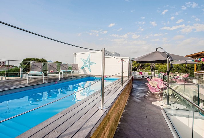 Chill-out-Dachterrasse mit Barservice, kleiner Pool (8 m x 2 m, beheizbar bis Mai und ab Oktober), Sonnenschirme (kostenfrei), Liegen (kostenfrei)