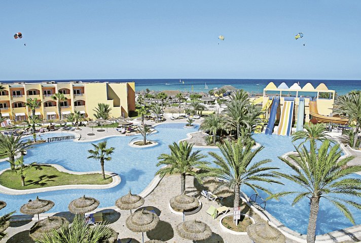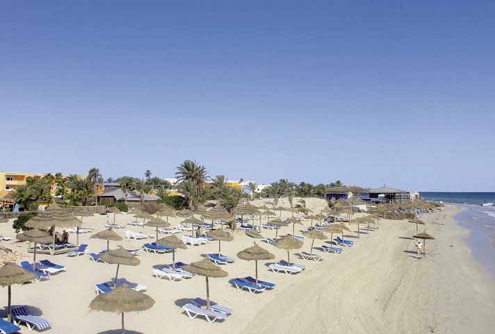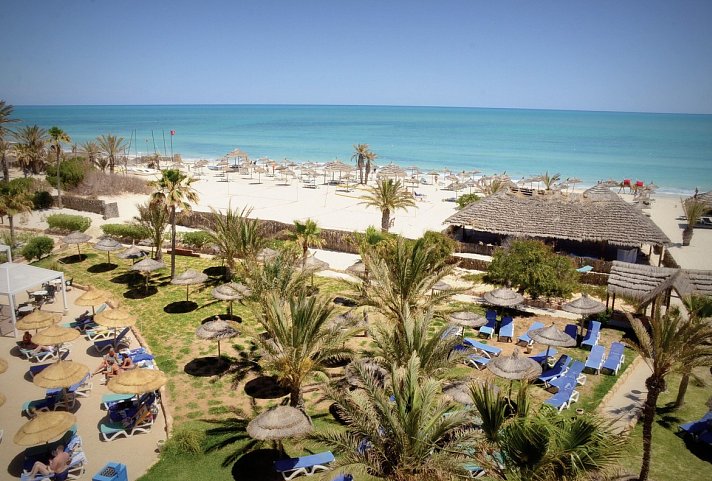 Die Anlage gleicht einer wunderbaren Oase auf der schönen Insel Djerba. Sie liegt direkt am Naturstrand und ist umgeben von einem Garten mit Palmen und Olivenbäumen. Familien verbringen hier wunderbaren Urlaub, für die Kleinen gibt es nämlich einen Aquapark!