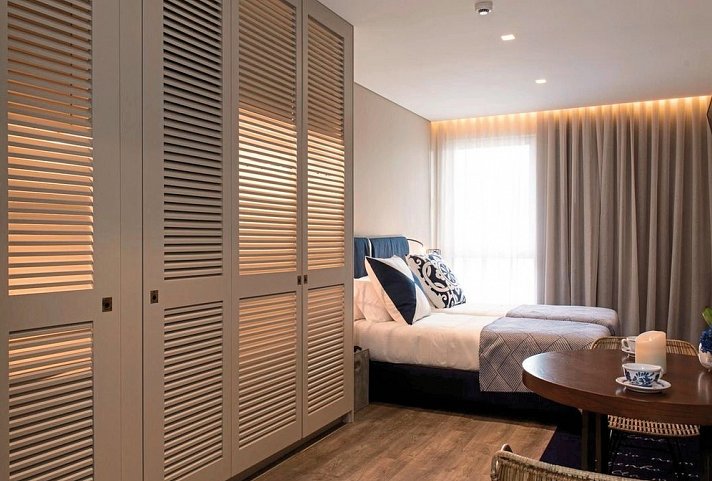 41-45 qm, Suite, optisch getrennter Wohn-/Schlafraum (mit Schiebetür), Schreibtisch, Sofabett, Dusche, Haartrockner, Klimaanlage, Minibar kostenpflichtig, Safe, TV, WLAN, Kochnische, Wasserkocher, Mikrowelle, Kaffee/Tee, Kühlschrank