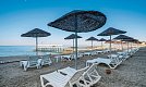 Kiesstrand: steil abfallend, teilweise Felsen, Sonnenschirme, Liegen, Strandtuch/Badetuch (gegen Kaution), Badesteg (Liegen, Schirme)