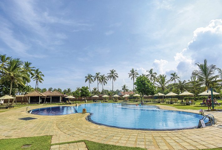 Familienfreundliches Resort mit einem Hauptgebäude und einem Bereich mit freistehenden Villen, die inmitten eines üppigen Palmenhains liegen.