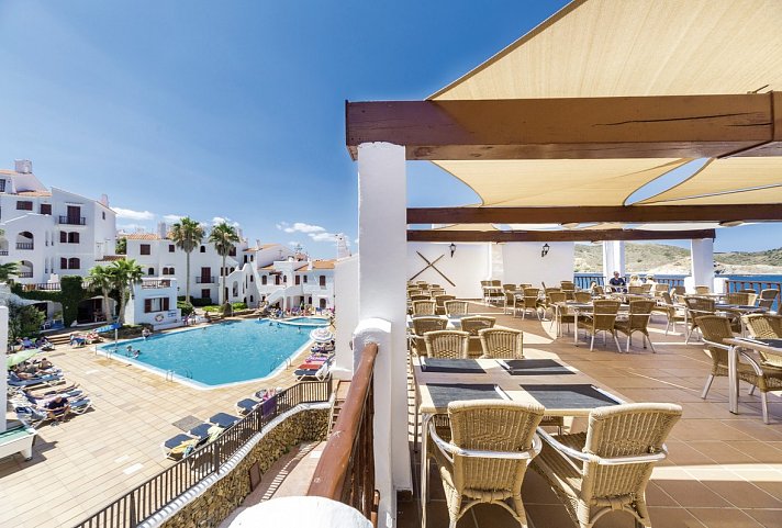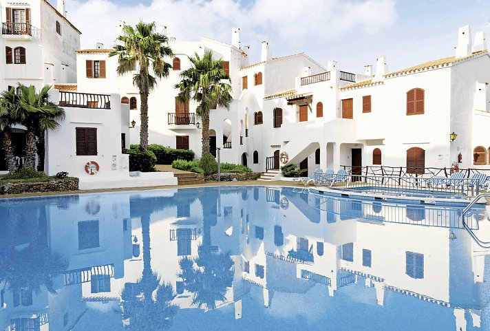 Im menorquinischen Stil erbaut, gruppieren sich die charmanten Apartmenthäuser um den Pool. Auf den Terrassen genießen Sie unvergessliche Momente mit spektakulärem Blick auf das Meer.