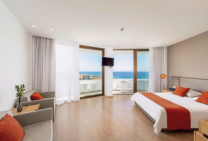 26-30 qm, Familien, Superior, Meerblick, Doppelbett (Kingsize), Sofabett, Dusche, WC, Bademantel, Badeslipper, Haartrockner, Klimaanlage, Mini-Kühlschrank, Safe, TV, Wasserkocher, Kaffee/Tee, Balkon (möbliert), Kopfkissen-Menü, hochwertige Badartikel, bei Ankunft im Zimmer Obst, Wasser, Sekt
