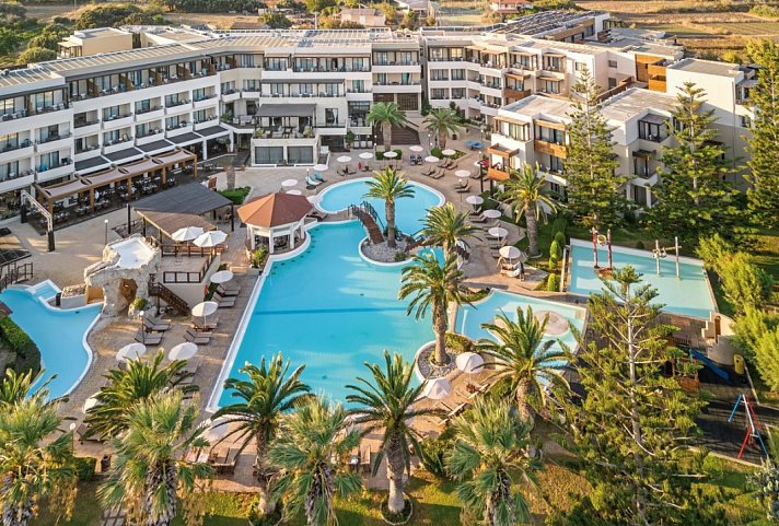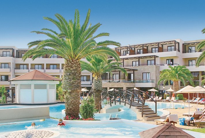 Endlich Urlaub! Erwachsene erfrischen sich im großen Pool oder lassen dort die Seele baumeln. Für Kids gibt es einen eigenen Pool mit Rutsche und auf alle wartet tolle Unterhaltung.