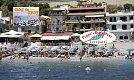 Kiesstrand: gehört zur Anlage, von der Anlage getrennt durch Straße, Sonnenschirme, Liegen