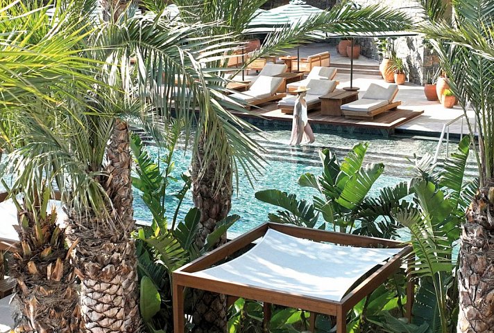 41-45 qm, Juniorsuite, Deluxe, kombinierter Wohn-/Schlafraum, 1 Bad, Dusche, Badewanne, WC, Bademantel, Badeslipper, Haartrockner, Kosmetikspiegel, Klimaanlage, individuell regulierbar, Minibar kostenpflichtig, Safe, TV (Sat-TV), WLAN, Kaffee/Tee, Terrasse (möbliert), Privatpool, hochwertige Badartikel