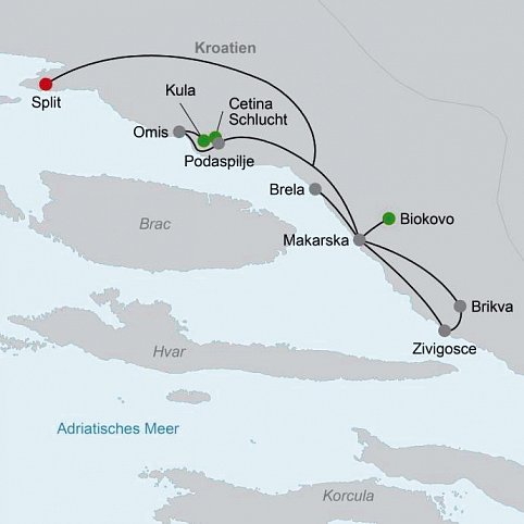 (Dienstag) Nach dem Frühstück fahren Sie entlang der Küste in Richtung Omiš, hier starten Sie Ihre Panoramatour. Zunächst folgen Sie dem alten Hirtenpfad, der Sie auf den Sattel bringt. Von hier aus können Sie die Ausblicke auf die Adria genießen. Unterwegs erreichen Sie die Schutzhütte Luda Kuca. Von nun an wandern Sie stetig weiter, bis Sie Podašpilje erreichen. Hier endet Ihre Wanderung. Höhenmeter: + 590 m/- 670 m/ca. 7,2 km/ca. 3,5 Std. (Frühstück, Mittagessen)
