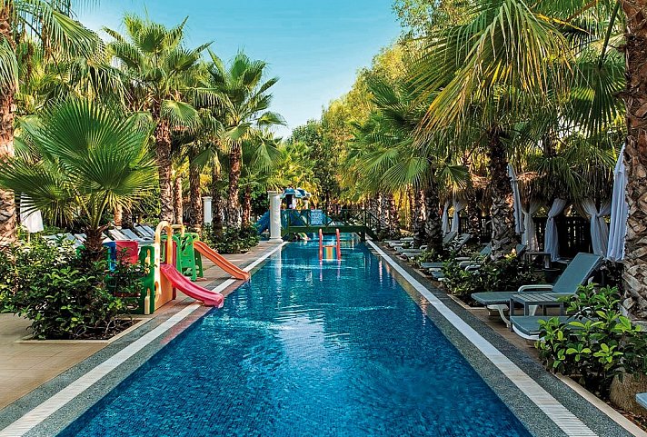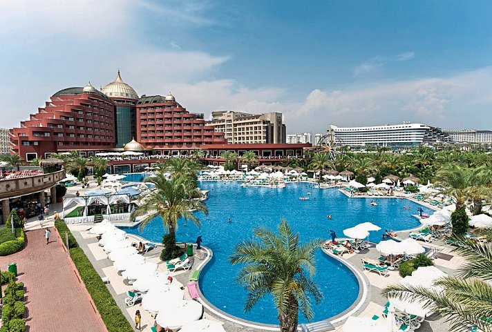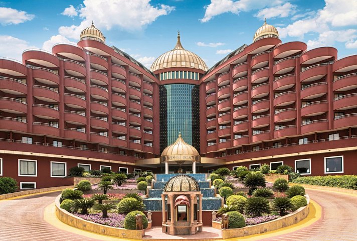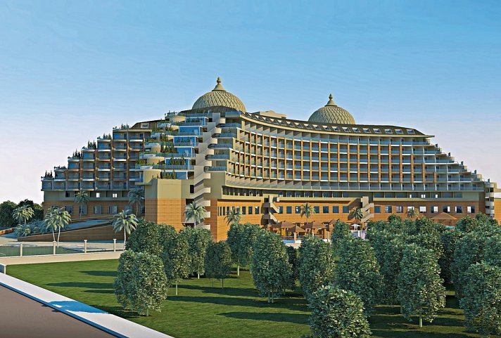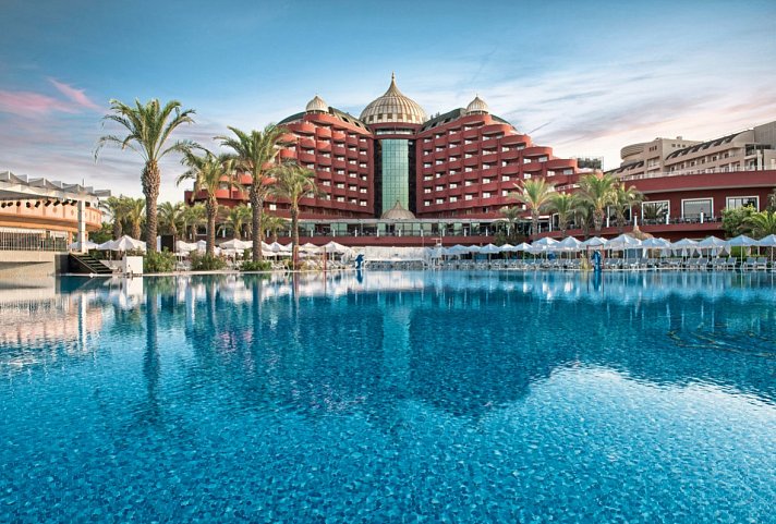 Am Strand von Lara erwartet Sie dieses Spitzenhotel. Es ist einem orientalischen Palast nachempfunden, sodass Sie sich wie im Märchen fühlen. Die riesige Empfangshalle mit prachtvollem Leuchter ist atemberaubend. Lassen Sie es sich schmecken – das Essen ist exquisit!