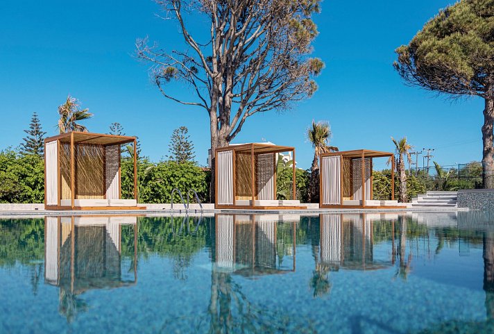 Warme Farben dominieren in diesem modern und geschmackvoll ausgestatteten Resort. Die loungig gestaltete Terrasse am Pool verheißt eine entspannte Auszeit unter der Sonne Kretas.