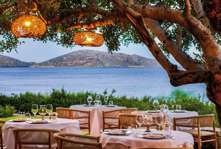 Frühstücksbuffet inklusive. Bei Buchung „Halbpension Dine Around" entweder gesetztes 3-Gänge-Menü im Yacht Club Restaurant oder im Il Borro Tuscan Bistro (Elounda Peninsula) oder Buffet im Nafsika Restaurant (Porto Elounda). Vom 5.5.- 15.5. wird das Abendessen vom Yacht Club Restaurant stattdessen im Deck Restaurant serviert. Bei Buchung „Premium Dine Around" darüberhinaus Teilnahme an den wöchentlichen Themennächten der Hotels Elounda Mare, Porto Elounda und Elounda Peninsula inklusive.