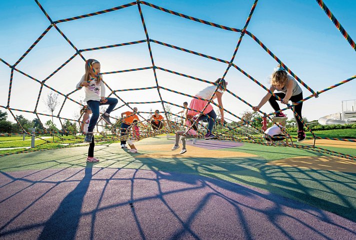 Moderne Familienanlage in wunderschöner parkähnlicher Umgebung mit verschiedenen Kinderspielgeräten