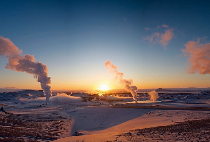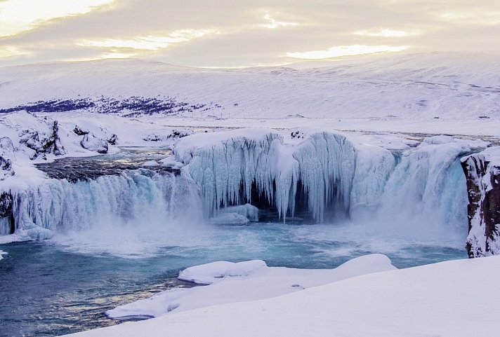 (Dienstag) Erster Stopp im winterlichen Nordland ist das Freilichtmuseum Glaumbær mit Einblicken in das bäuerliche Leben Islands und der für Island typischen Torfbauweise. Danach fahren Sie weiter, bis Sie Akureyri, die Hauptstadt des Nordens, für einen Zwischenstopp erreichen. Weiter geht es zum Wasserfall der Götter - Godafoss, einer der spektakulärsten Wasserfälle Islands. Das Wasser des Flusses Skjalfandafljot stürzt hier auf einer Breite von 30 m ca. 12 m in die Tiefe. In den Wintermonaten bilden die gefrorenen Wassersäulen wunderschöne Eisskulpturen. Den Namen erhielt der Wasserfall der Sage nach als im Jahr 1000 n. Chr. während der Christianisierung Islands der Gesetzeshüter Thorgeir Ljosvetningagodi die Statuen der nordischen Götter in den Wasserfall warf. Anschließend gelangen Sie auf dem Diamond Circle zu einem weiteren Highlight Ihrer Reise - der See Myvatn ist mit seiner schier unglaublichen Vielfalt an vulkanischen Erscheinungen eine der Hauptattraktionen Islands. Das gefrorene Vulkanparadies um den See Myvatn mit blubbernden Schlammtöpfen, bizarren Wasserfällen und einem einzigartigen Naturbad machen die Region zu einem besonderen Erlebnis. Entdecken Sie eine der wichtigsten Traditionen der Isländer. Die isländische Badekultur, die nicht aus dem Alltagsleben der Menschen wegzudenken ist. Man trifft sich in den warmen Thermalbädern zum Plaudern, gemeinsamen Gesellschaftsspielen und vielem mehr. Beim Entspannen im natürlichen und warmen Geothermalwasser des Naturbades Jardbödin, werden Sie schnell verstehen warum dies für die Menschen zu jeder Jahreszeit so wichtig ist (fakultativ). Eine Nacht in der Umgebung des Sees Myvatn. Ca. 350 km/ca. 5 Std. (Frühstück)