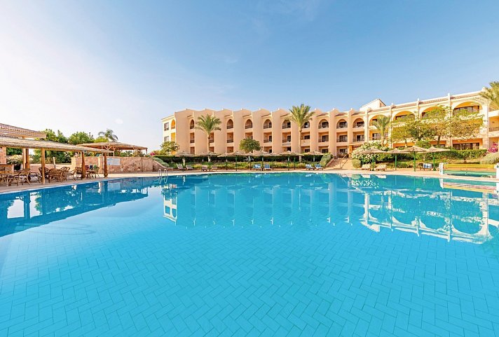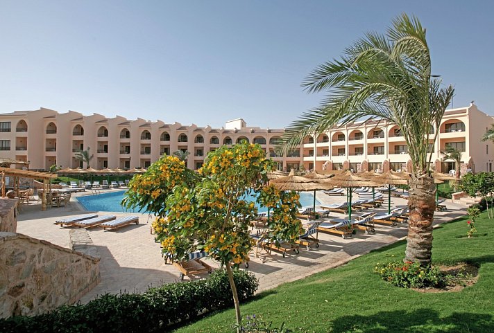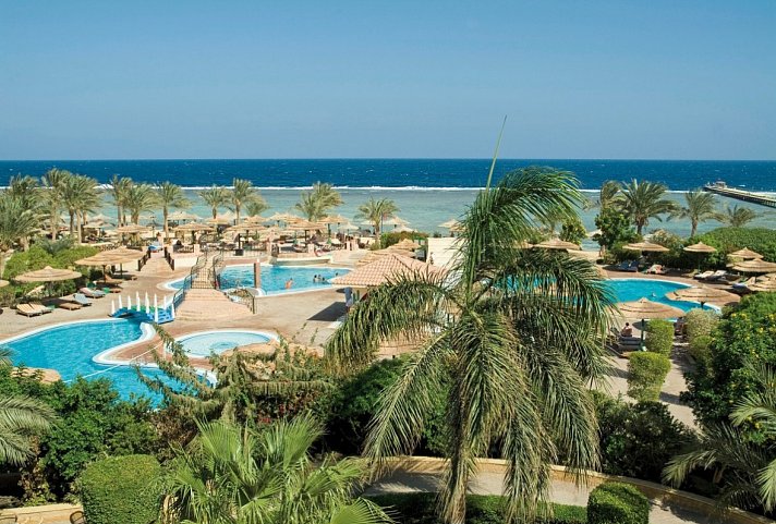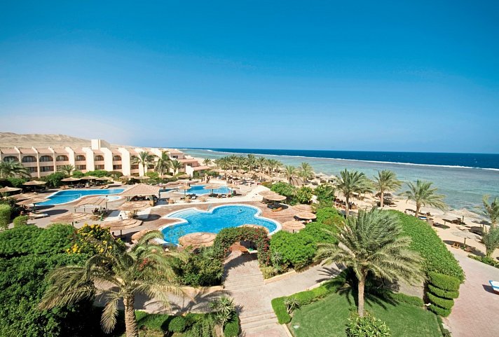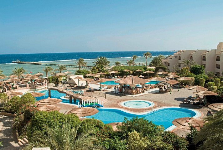 Sandstrand: Abu El-Sawatier, ca. 4 km entfernt (Shuttle-Bus, kostenpflichtig), flach abfallend, gehört zur Anlage, ca. 600 m lang, Sonnenschirme, Liegen, Strandtuch/Badetuch, Badesteg