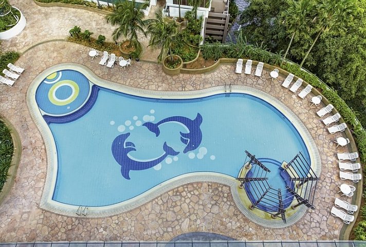 Stattliche Marmorsäulen und edle Kronleuchter begrüßen Sie in der Lobby. Familien mit Kindern freuen sich über die Themenzimmer: Unterwasserwelten, Piratenszenen, Schlosskulisse.