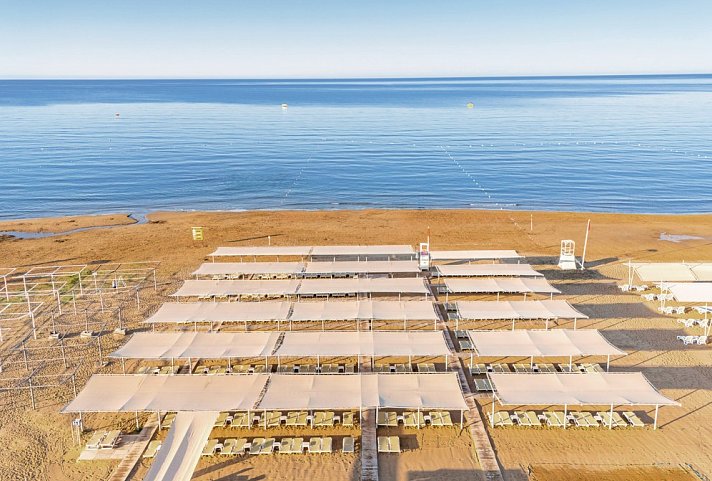 Sandstrand: leicht abfallend, gehört zur Anlage, ca. 150 m lang, Sonnenschirme, Liegen, Strandtuch/Badetuch, ca. 01.04.-31.10.