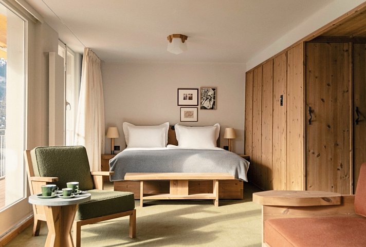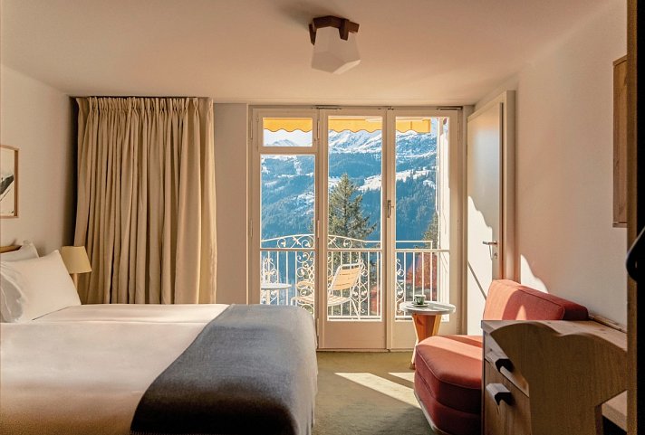 Jedes architektonische Detail der 90 Zimmer und Suiten, sorgfältig im zeitlosen alpinen Stil gefertigt, spiegelt das reiche handwerkliche Erbe des Berner Oberlandes wider. Zur Ausstattung zählen Bad mit Badewanne/Dusche, Föhn, WLAN, Bang & Olufsen-Lautsprechersystem, Flachbild-TV, Telefon, Kaffeemaschine, Wasserkocher, Teesortiment, Minibar, Safe.