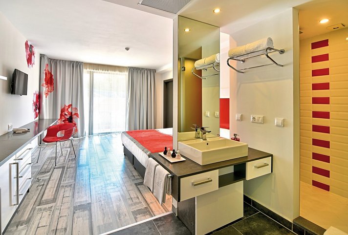 26-30 qm, Doppel, Gartenblick, Poolblick, Nichtraucher, 1 Bad, Dusche, WC, Haartrockner, Laminatboden, Klimaanlage, Korridor/Flur, Minibar, Auffüllung regelmäßig, Bier, Säfte, Wasser, Safe (kostenpflichtig), 1 TV (Sat-TV, deutschsprachiges Programm, landestypisches Programm, Flachbildschirm), WLAN, Kaffee/Tee, Balkon (möbliert), Bettwäschewechsel, Handtuchwechsel