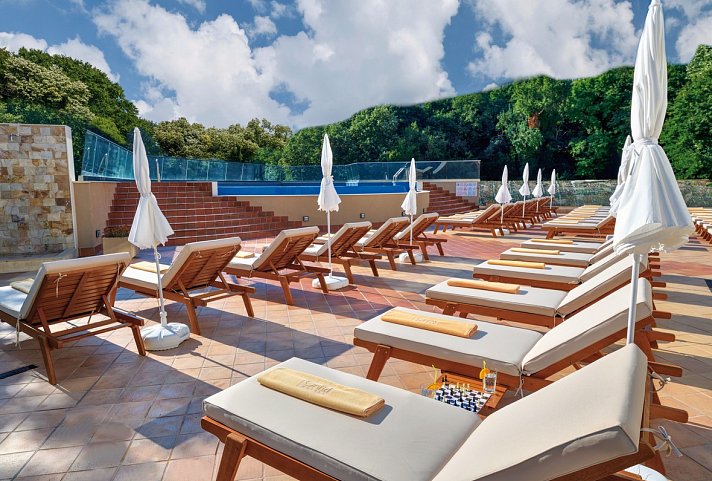 1 Pool: Sonnenschirme, Liegen, Badetuch