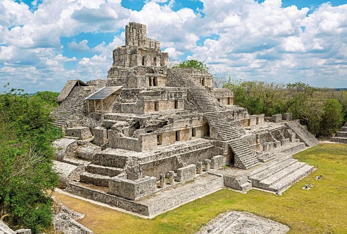 Fahrt nach Edzná, einem ehemaligen Zeremoniezentrum. Das schönste Gebäude von Edzná ist sicher das „Gebäude der fünf Stockwerke“, eines der interessantesten Bauwerke der gesamten Mayakultur. Weiterfahrt nach Campeche, der ehemals reichsten Stadt Yucatáns. Die Stadt wurde aufwändig restauriert und ist seit 1999 Weltkulturerbe der UNESCO. Lohnenswert ist ein Besuch der alten Festungsanlagen. Die Stadt Campeche ist von einer Mauer umgeben, die früher zum Schutz vor Piraten diente. Auf einem Rundgang besichtigen Sie die kleinen Gässchen der bedeutenden Hafenstadt mit restaurierten Kolonialgebäuden, dem Zócalo und der Kathedrale La Concepción. Lassen Sie sich zurückversetzen in die Zeit der spanischen Eroberer. Eine Nacht im Hotel Castelmar (Mittelklasse, Landeskategorie: 3 Sterne) in Campeche. Ca. 200 km (Frühstück)