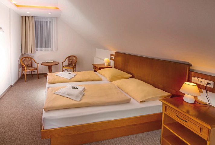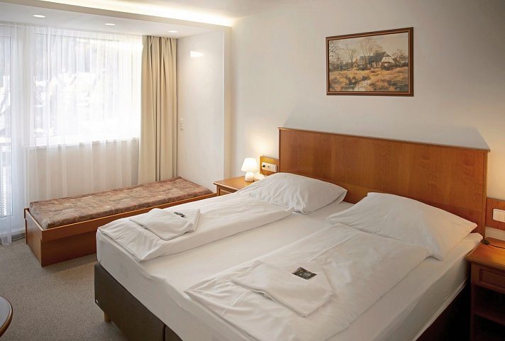 16-20 qm, Doppel, 2 Einzelbetten, 1 Bad, Dusche, WC, Bademantel, Haartrockner, Heizung, zentral gesteuert, Safe, 1 TV (Sat-TV), WLAN, Kaffee/Tee, Kühlschrank