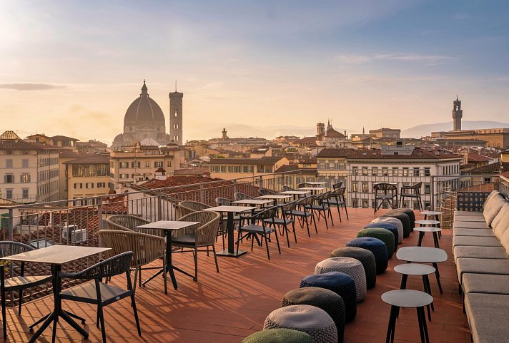 Toller 360 Grad Blick von der hoteleigenen Dachterrasse auf die umliegenden Sehenswürdigkeiten wie den Dom und die florentinischen Hügel