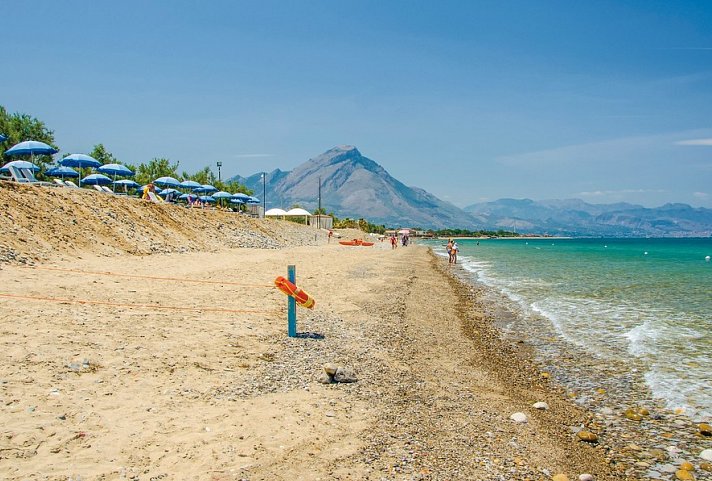 Sand-/Kieselstrand: gehört zur Anlage, von der Anlage getrennt durch Straße, Sonnenschirme, Liegen, Strandtuch/Badetuch (kostenpflichtig)