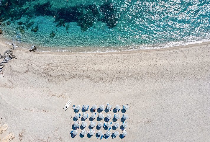 Liegen und Sonnenschirme am Strand kostenfrei (begrenzte Anzahl pro Zimmer) ab der 2. Strandreihe bis 26.6. und ab dem 30.8.