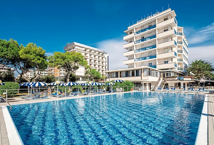 Im Badeort Bibione mit märchenhaft riesigem Sandstrand ergänzt das Hotel das Meereserlebnis mit großem Pool und Kinderbecken inmitten der Grünanlage. Der Blick schweift vom Balkon über das weite Meer.