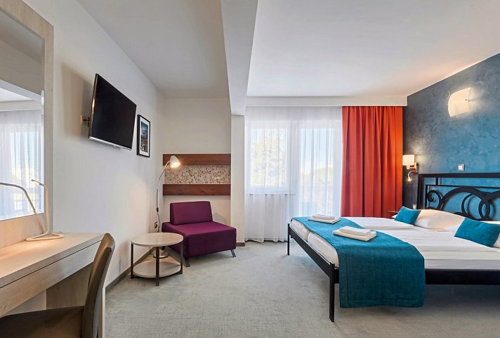 16-20 qm, Doppel, renoviert, Sitzecke, Dusche, WC, Haartrockner, Klimaanlage, Heizung, Minibar kostenpflichtig, Safe, TV (Sat-TV), Balkon (möbliert)