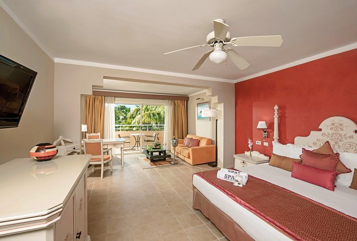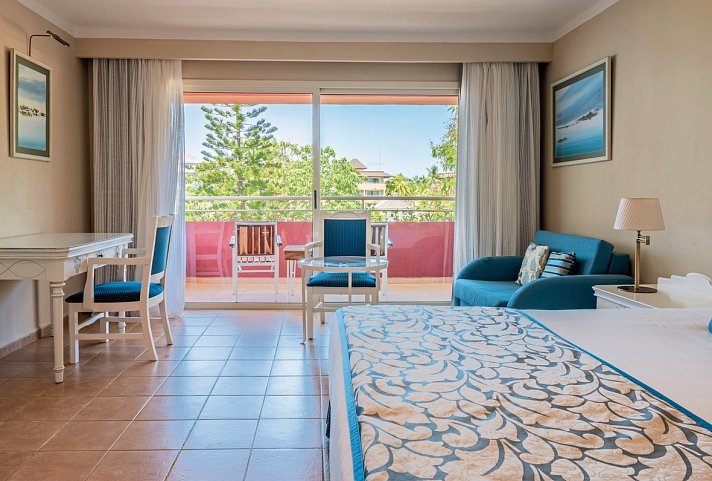51-60 qm, Juniorsuite, Couch, Dusche, Badewanne, Bademantel, Badeslipper, Haartrockner, Klimaanlage, Safe, Bügeleisen, 1 TV (Sat-TV), WLAN, Kühlschrank, Balkon oder Terrasse (möbliert), bei Ankunft im Zimmer Wasser