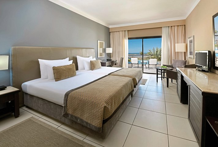 Doppel, ca. 35 qm, Superior, Poolseite, Meerblick (zum Teil seitlich), Twinbett, Dusche, Haartrockner, Kosmetikspiegel, Fliesen, Klimaanlage, Minibar kostenpflichtig, Safe, TV, Kaffee/Tee, Terrasse (möbliert)